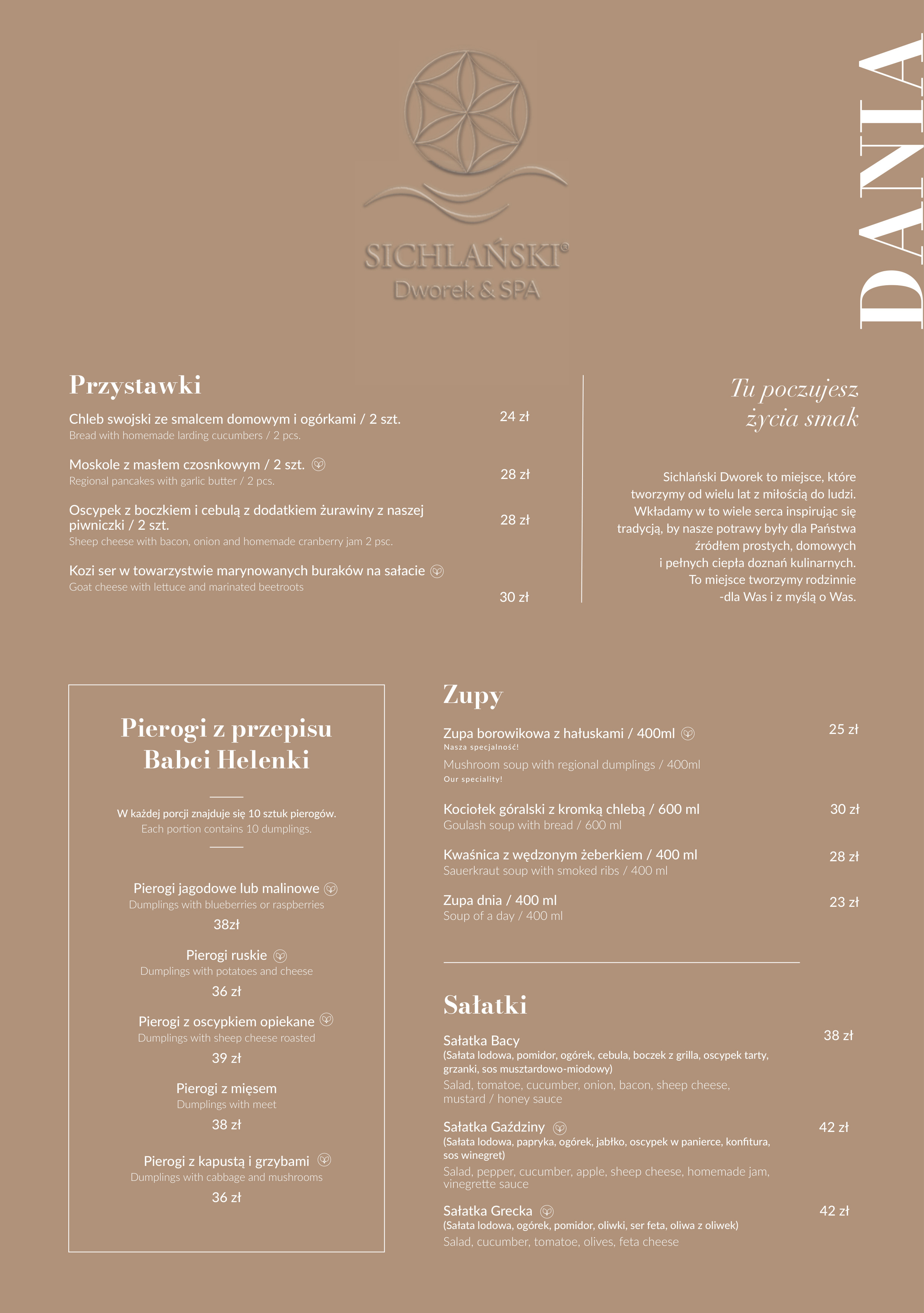 Gorąco zapraszamy do naszej restauracji, w której czeka na Państwa wyjątkowa atmosfera i bogate menu z regionalnymi przysmakami. Potrawy przygotowujemy z ekologicznych produktów, a naszą specjalnością są dania z jagnięciny (np. pierogi jagnięce z sosem borowikowym), oparte na tradycyjnych regionalnych recepturach oraz doskonałe świeże produkty, które serwujemy w prosty, elegancki sposób.